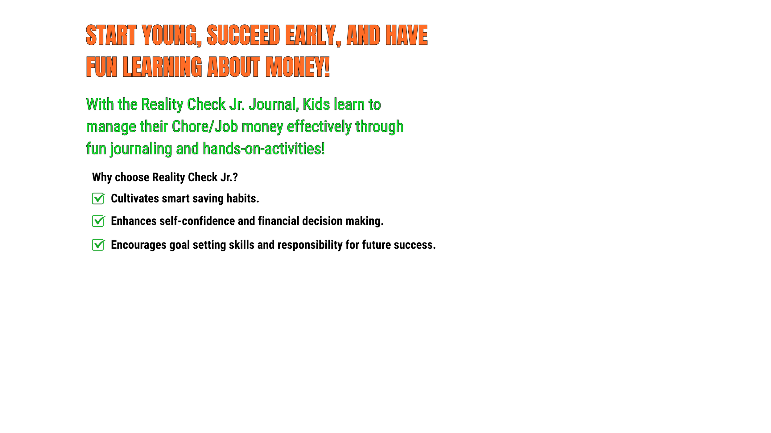 You may be here because you have purchased the Reality Check Jr. Program. From this point forward, we embark on an exciting journey together! Our mission is to empower young minds with the tools and resources to navigate their paths to success through engaging activities and a supportive community, we aim to build confidence and develop essential life skills. As you explore your kit and participate in our program, remember that you are a valued member of a vibrant community dedicated to growth and discovery.